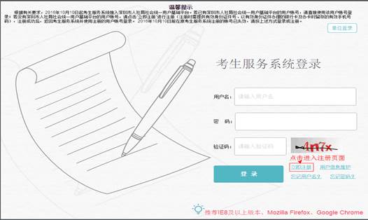 自2016年10月10日起,考生服务系统接入统一用户平台,考生可随时登录考生服务系统(https://ks.sz12333.gov.cn/ess/或https://sz12333.gov.cn/ess/)进行注册,无需等待相关考试报名开始。