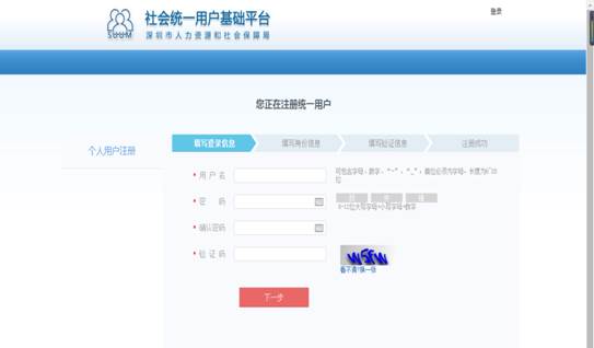 1.填写登录信息:输入用户名、密码、确认密码、验证码,点“下一步”进入填写身份信息页面。