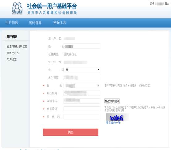3.在“用户信息”界面,可修改注册信息(允许修改的信息包括姓名、银行、银行账号、手机号码);也可切换到“密码管理”或“密保工具”栏分别进行密码管理或密保问题设置。如下图所示: