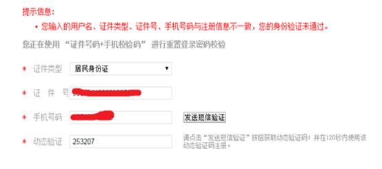 说明:手机号码必须为注册时填写的手机号码,若填写其他号码,虽能接收短信验证码,但点击“下一步”时无法通过验证,如下图所示。如注册时填写的手机号码已停用,请按本指南“常见问题”中第十一个问题的解答进行处理。