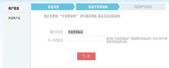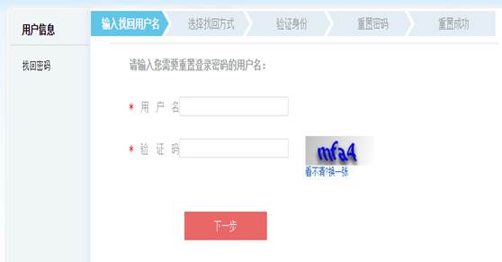 1.输入用户名:输入用户名和验证码,点“下一步”进入选择找回方式页面。