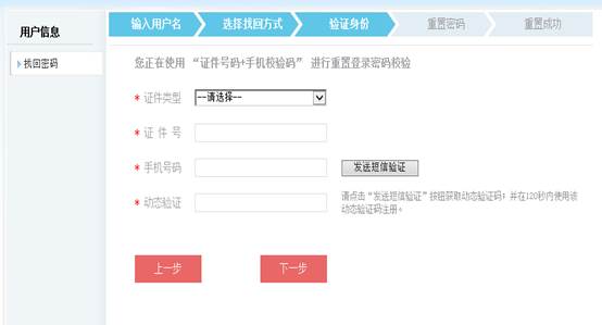 3.验证身份:(1)证件号码+手机验证码:选择证件类型,输入证件号、手机号码,点击“发送短信验证”,输入获取的动态验证码后点击“下一步”进入重置密码界面。