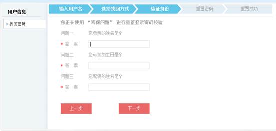 (2)密保问题:依次输入3个密保问题的预留答案后,点击“下一步”进入重置密码界面。