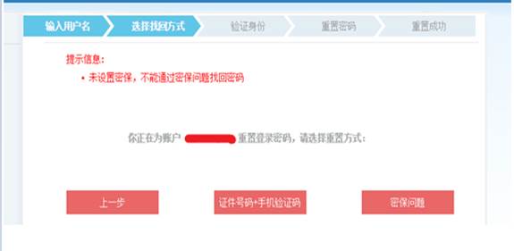 说明:选择密保问题时,若未设置密保问题,则提示“未设置密保,不能通过密保问题找回密码”。建议用户注册成功后,立即通过“密保工具”菜单设置3个密保问题。