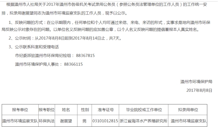 ^原标题:2017年温州市环保局(市环境监察支队)拟录用人员公示