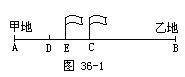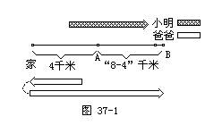 【分析】先画出示意图图37-1如下(图37-1中A点表示爸爸第一次追上小明的地方,B点表示他第二次追上小明的地方)。从图37-1上看出,在相同时间(从第一次追上到第二次追上)内,小明从A点到B点,行完(8-4=)4千米;爸爸先从A点到家,再从家到B点,行完(8+4=)12千米。可见,爸爸的速度是小明的(12÷4=)3倍。从而,行完同样多的路程(比如从家到A点),小明所用的时间就是爸爸的3倍。