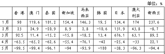 一月到五月,北京出境旅游变化幅度最大的目的地国家或地区是( )。