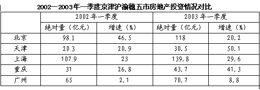 2003年一季度,京津沪渝穗五市分别实现房地产投资118亿元、30. 5亿元、 139.