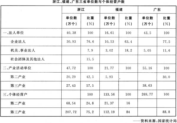 90.C[解析]广东省第二、第三产业在个体经营户中的不平衡程度超过福建,故A项不准确。表格中并没有提到产业活动单位的职工总数,B项说法无根据。广东省机关事业法人单位数量约为43.5×11.6%≈5.05(万个),福建省为3.02万个,浙江省为3.2万个(根据第86题计算结果),故C项说法正确;D项中有关经济总量的数据在表格中并无反映,故D项错误。