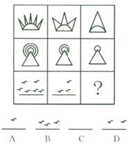 47.A【解析】这道题考查的是笔画数,第一个图形为一画,第二个图形为两画,第三个图形为三画,问号处也应符合这一规律,为三画,所以A项为正确答案。