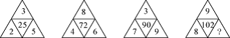 【解析】原数列具有如下关系:(2+3)×5=25,(4+8)×6=72,(3+7)×9=90,(8+9)×(6)=102。