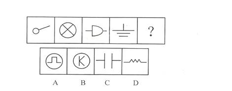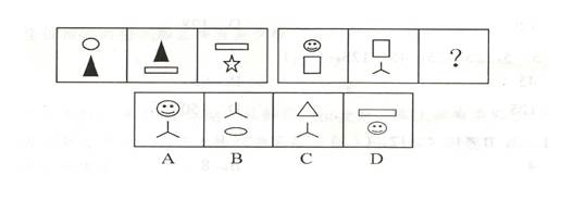 66.B.【解析】样式类。每个图形由上下两个元素构成。由题干可知,后一个图形上面的元素与前一个图形下面的元素相同且下面的元素为新元素,依此规律观察选项,可知B选项符合题干规律。所以选择B选项。