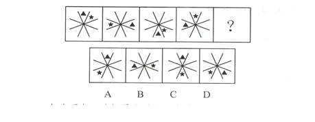 67.A.【解析】位置类。题干前一个图形中黑色三角形顺时针移动两格同时黑色五角星逆时针移动三格得到后一个图形,依次规律观察选项,可知A选项符合题干规律。所以选择A选项。