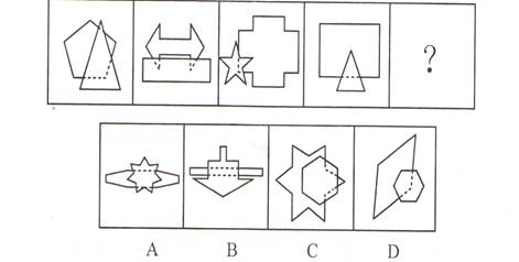 69.C.【解析】样式和数量结合类。题干各图均由两个图形构成,且边数少的图形位于边数多的图形上方,边数多图形被覆盖区域用虚线标示。依此规律观察选项,可知C选项符合题干规律。所以选择C选项。