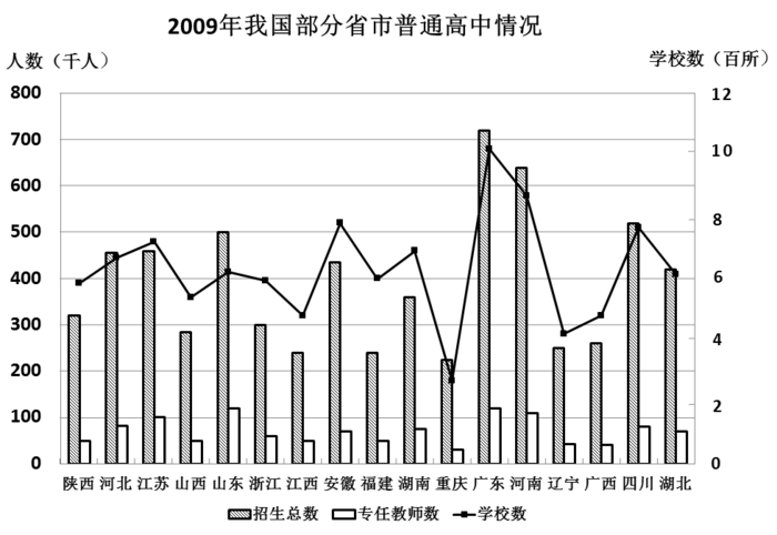 B选项,招生数湖南<安徽,专任教师湖南>安徽,所以前者比值小于后者,B选项错误;