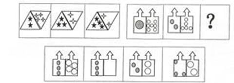 【解析】第一组图中,左边黑色五角星的个数变化是2、3、4,白色四角星的个数间存在计算关系,即4-2=2;第二组的图形间,黑色圆的数量变化是1、2、?,因此填3,白色圆的数量变化是7-5=?,因此填2;所以本题正确答案选择D项。
