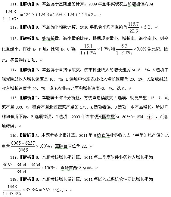 109.【解析】A。本题考核比重的计算。2011年1~9月,全国规模以上船舶工业企业完成出口交货值占全国规模以上船舶企业工业总产值中的比重与2010年该比重相比,下降了约2394/5734-[2394/(1+16%)]/[5734/(1+24.6%)]=-3%。