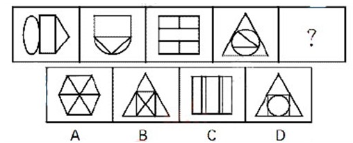 73.【解析】B。题干图形的封闭空间的数量分别为3、4、5、6个,因此问号处应填入一个含有7个封闭空间的图形,只有B项符合。