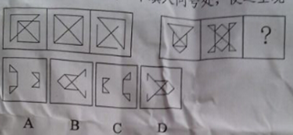 72.【解析】A。本题整体观察图形没有规律,整体观察没规律可以观察局部。可以看到一组图形中,局部看,图形数量上呈现:3,4,5,6,?,8的规律,故应补入直线数为7个的图形,答案为A。