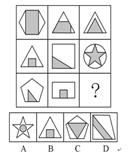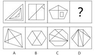 85.B【解析】本题考查图形内外的交线数,每个图形由外部图形与内部黑色图形构成,第一列图形内外图形的交线数分别为2,1,1;第二列图形内外图形的交线数分别为3,2,1;可知列进行相减2-1=1,3-2=1,则第三列应为1-0=1,即答案的相交线应为1条。因此,本题答案为B选项。