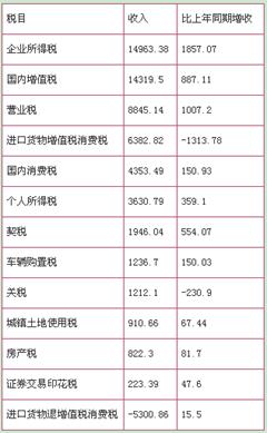 ④项,2013年我国上半年企业所得税税收14963.38、国内增值税税收14319.5,两项之和为29282.88,占全国税收总收入比重为29282.88/59260.61<1/2,故④错误。