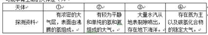 10.“旅行者1号”空间探测器历经36年的人类星际探索,沿途探测①木星、②土星、③土卫二、④土卫六是否存在生命痕迹,并发回资料。阅读表格,依据探测资料判断将来最有可能孕育生命的天体是()。