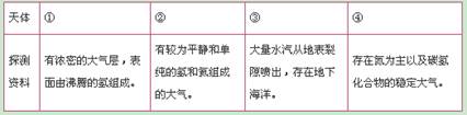 17.“旅行者1号”空间探测器历经36年的人类星际探索,沿途探测①木星、②土星、③土卫二、④土卫六是否存在生命痕迹,并发回资料。阅读表格,依据探测资料判断将来最有可能孕育生命的天体是()。