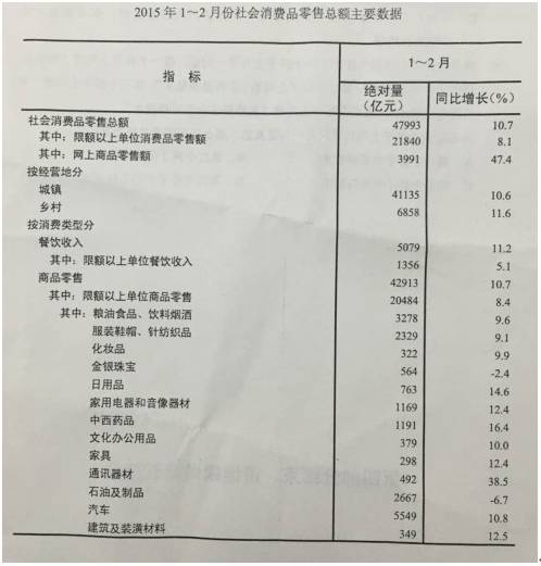 113.下列四类商品中,2015年1~2月份商品零售额同比增长最快的是: