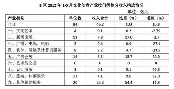 2015年1-5月,B区规模以上文化创意产业完成收入46.2亿元,比上年同期增长10.8%,比1-4月增幅收窄0.8个百分点,从业人员平均人数1.3万人,比上年同期下降2.4%。