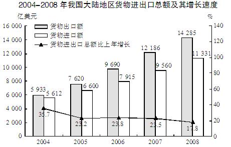 2004-2008年我国大陆地区货物进出口总额及其增长速度