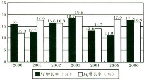 下图为2000一2006年我国两种层次货币供应量M1和M2的增长率。根据此图回答下面的111一115题。(注:该图中M1和M2的增长率都为百分数)