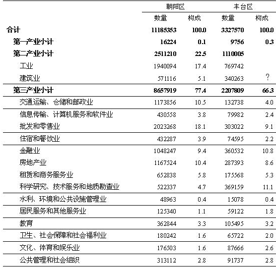 110. 丰台区第三产业比例最大的行业比朝阳区第三产业比例最小的产业多: