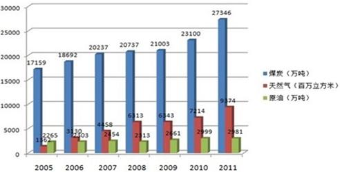 2005~2011年江苏省煤炭、天然气和原油消费情况