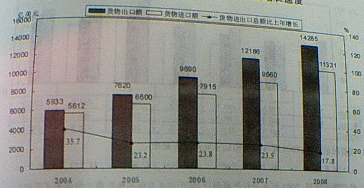 A、2004-2008年全国货物出口额是逐年上升的 B、2004-2008年全国货物进出口额增长率是逐年上升的