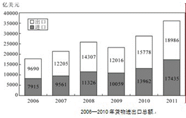 2011年我国全年货物进出口总额36421亿美元,比上年增长22.5%。其中,出18986亿美元,增长20.3%:进口17435亿美元,增长24 9%。进出口差额(出口值与进口值差额的绝对值)1551亿美元,比上年减少265亿美元。
