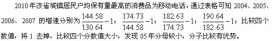 本题解析:通过表格很容易发现 电冰箱、空调、彩色电视、移动电话超过。