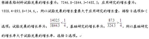 【解析】 A选项根据第一段材料可以分别求出2009年以及2010年的国内生产总值,因此2010年我国的国内生产总值的同比增速可以求出;B选项可以根据第一段材料求出2009年的投入经费以及2009年的人均经费,用投入总经费除以人均经费即可得到人数;C选项中根据材料无法得到2009年研究机构的经费投入状况,所以C选项无法推出;D选项可以从文字材料的第二段话中找到依据,因此本题选择C选项。