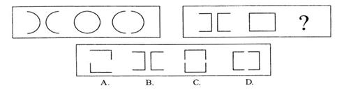 解答:正确答案为D。因为只有D能使两套图形具有相似性,仅仅元素不同,一个是半圆,一个是正方形,但两组图形中元素的排列规律相同。