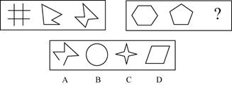【解析】 这是一道"5+1"题型的图形推理题,规律类别为数量关系。仔细地比较题干中给出的左边5个图形,不难发现,左边5个图形除第1个小图外都是等边图形,根据相等的边的数目,正好构成一个自然数列:1(圆可看成一条等边)、2、3、4、5,依据这一规律,可以推出第6个小图形应该具有6条相等的边,选B。