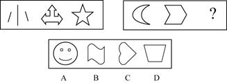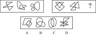 【解析】 这是一道"5+1"题型的图形推理题,规律类别为组合关系。仔细地比较题干中给出的左边5个图形,不难发现,左边5个图形,每个小图形中外图的直边数都大于内图的直边数,依据这一规律,选D。