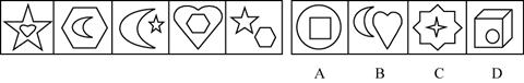 【解析】 这是一道"5+1"题型的图形推理题,规律类别为数量关系。仔细地比较题干中给出的左边5个图形,不难发现,左边5个图形,每个小图都由2种图形组成,依据这一规律,选C。
