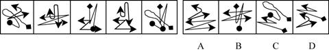 【解析】 这是一道"5+1"题型的图形推理题,规律类别为组合关系。仔细地比较题干中给出的左边5个图形,不难发现,左边5个图形,每个图却由2条曲线组成,并在排列上呈现出一定的规律性,即奇数格中的图是由不同的两条线叠加在一起的,而偶数格中的图是由相同的两条线(双箭头线)叠加在一起的。依据这一规律,可以推出第6个小图也应由两条双箭头线叠加在一起,选A。