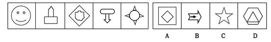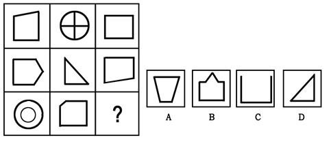 【解析】题中图形都是把一个空间分成两个部分或者不分,选项中的C和D都被分成四部分,首先排除掉。然后以竖排为一组,前两组都是有两个轴对称图形,则第三组也应该是两个轴对称图形。故选A。