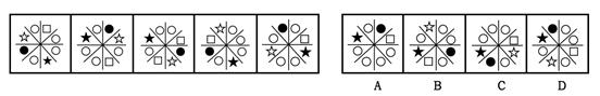 【解析】考虑实心圆形,它每次都按顺时针方向转动,依次转动了3、2、3、2格。下一次它应该转到如B所示的位置。故选B。