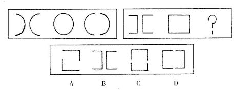 解答:正确答案为D。因为只有D能使两套图形具有相似性,仅仅元素不同,一个是半圆,一个是正方形,但两组图形中元素的排列规律相同。