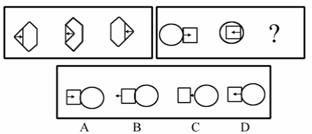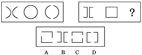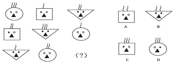 三、图形推理:共10题。每道题包含两套图形和可供选择的4个图形。这两套图形具有某种相似性,也存在某种差异。要求你从四个选项中选择你认为最适合取代问号的一个。正确的答案应不仅使两套图形表现出最大的相似性,而且使第二套图形也表现出自己的特征。
