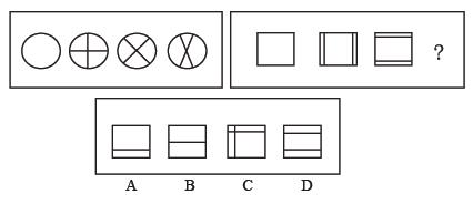 解答:正确答案为D。因为只有D能使两套图形具有相似性,仅仅元素不同,一个是半圆,一个是半个正方形,但两组图形中元素的排列规律完全相同。