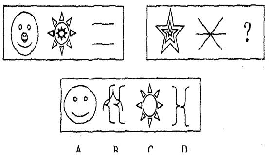 解答:正确答案应为A。左边图形中1个小星形相当于2个小圆形,通过换算,左边每格中均为14个小圆形。