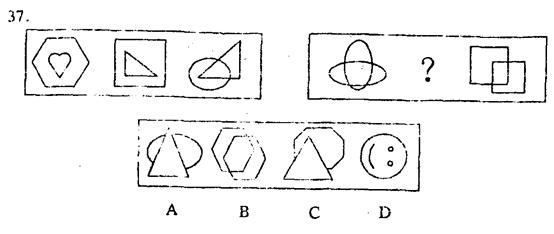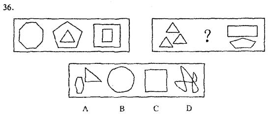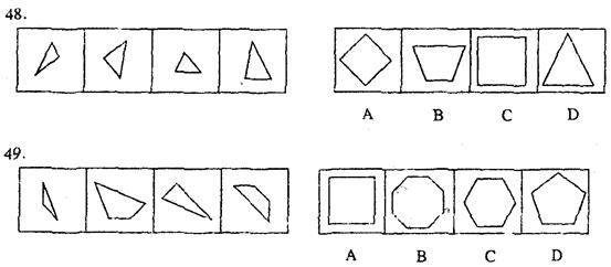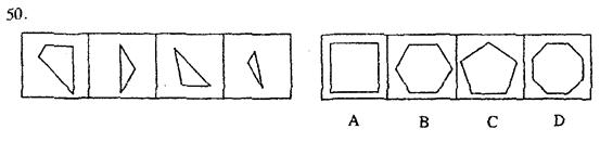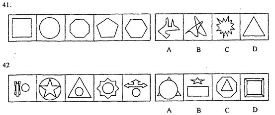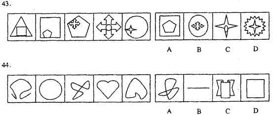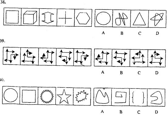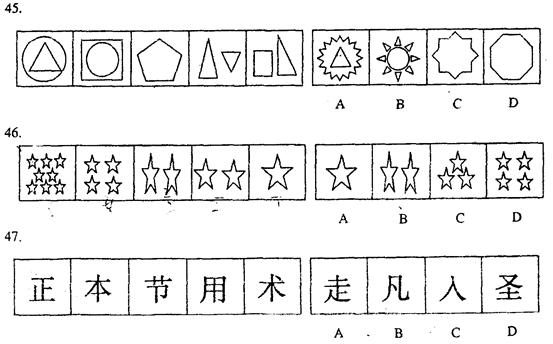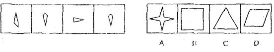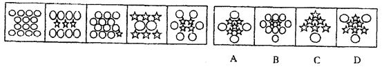 (二)每道题在左边的题干中给出一套图形,其中包括五个图,这五个图形呈现一定的规律性。在右边给出一套图,其中有四个图,让考生从中选出一个作为保持左边五个图规律性的第六个图。