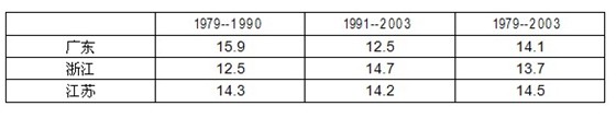 广东、江苏、浙江第三产业不同时期年均增长情况比较(单位:%)